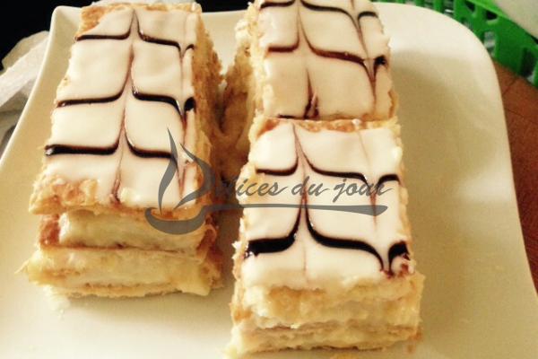 Pour le glaçage, mélanger le sucre glace avec le blanc d'oeuf jusqu'à obtenir un mélange homogène puis le verser sur le mille-feuille et bien lisser pour le répartir sur tout la surface. Faire des traits avec le chocolat et passer au milieu pour faire les rayures comme sur la photo.