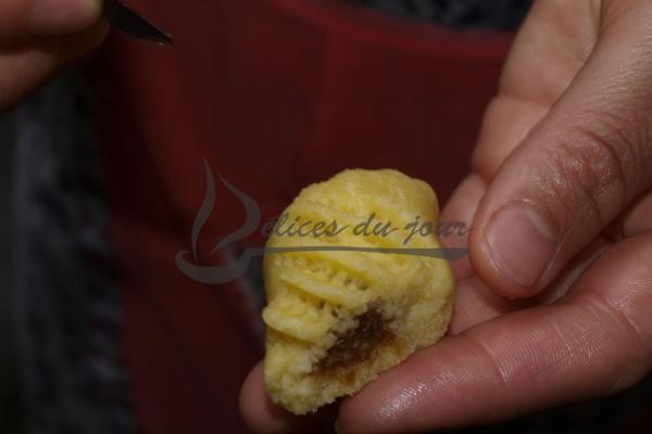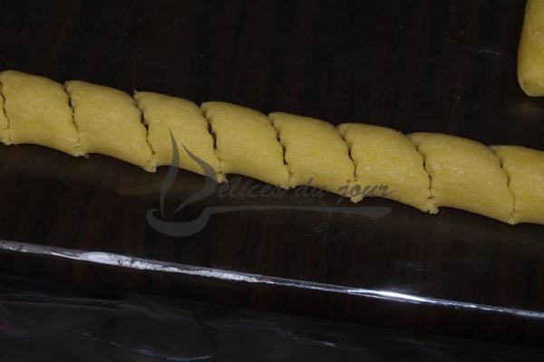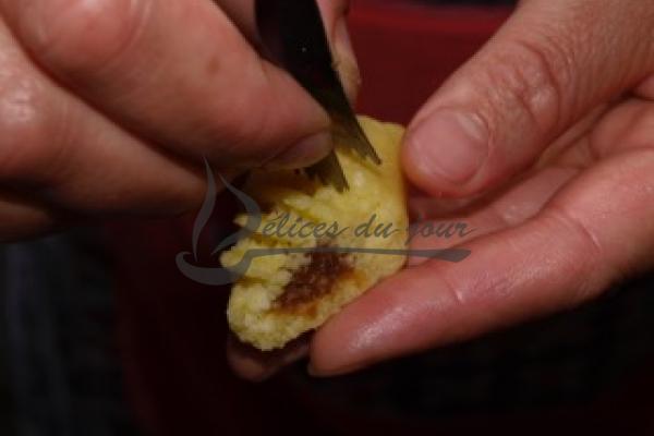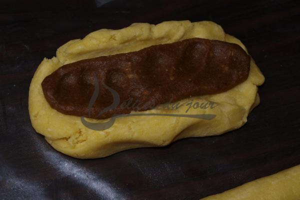 Former des boudins de pâte, faire une fente avec le pouce et y mettre un boudin de datte.