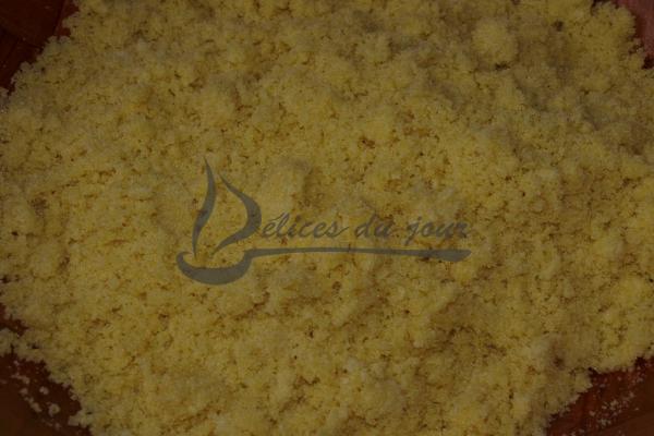 Dans un grand plat, mettre la semoule et le sel en formant un puit. Ajouter le beurre fondu tiède. Bien mélanger pour incorporer le beurre à la semoule. Ajouter un peu d'eau de fleur d'oranger et d'eau pour avoir une pâte qui se tient bien mais sans pétrir. Couvrir et laisser reposer. Pendant ce temps, préparer la face. Mélanger la pâte de datte, l'huile, la cannelle et les graines de sésame jusqu'à ce qu'elle soit molle et laisser de coté.