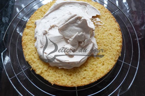 Goûter et ajouter du praliné ou du sucre glace si besoin. Monter le mélange pour avoir une crème bien épaisse qui se tient bien. Etaler un couche de crème sur une des deux partie du gâteau
