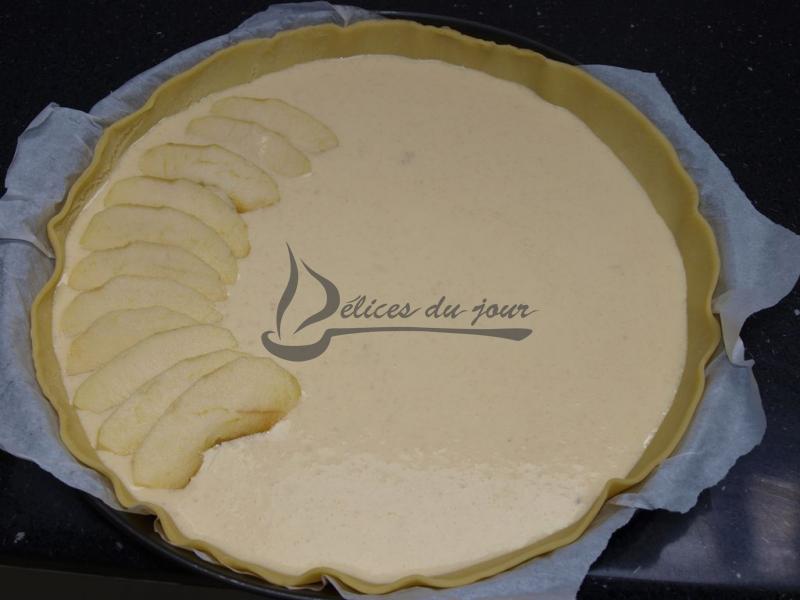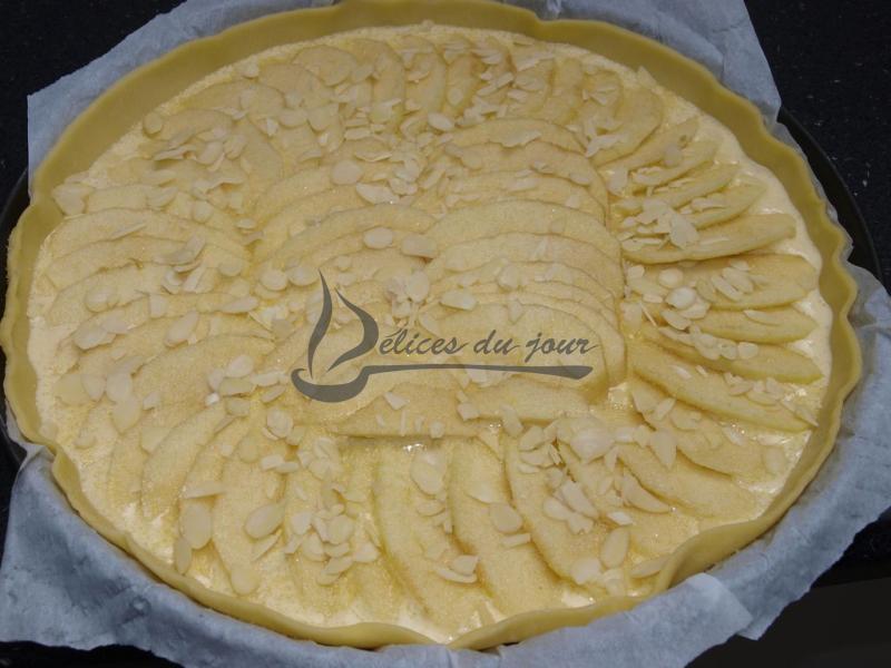 Tarte aux pommes avec une garniture à la crème et aux amandes qui peut être accompagnée d'une boule de glace à la vanille.