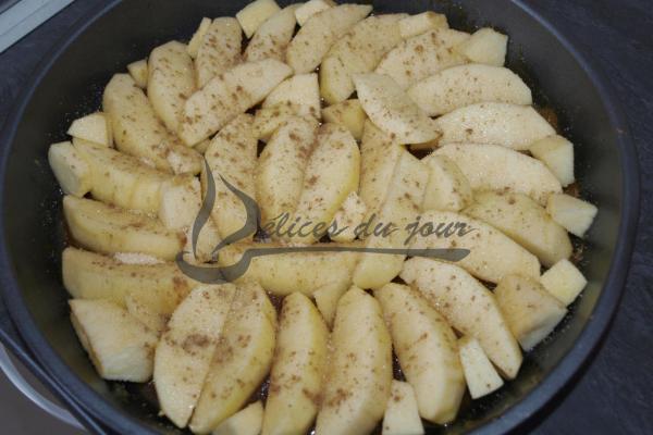 Faire cuire les pommes une dizaine de minutes dans un four préchauffé avant de déposer la pâte feuilletée par dessus. Découper le surplus de pâte et rentrer les bords à l'intérieur du moule, à l'aide d'un couteau, faire un petit trou au milieu de la pâte afin de laisser échapper la vapeur durant la cuisson.