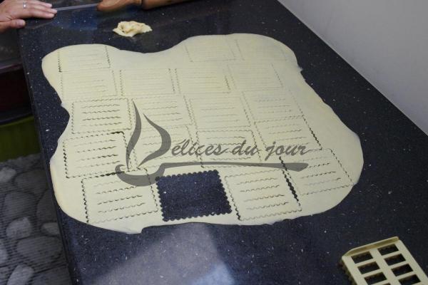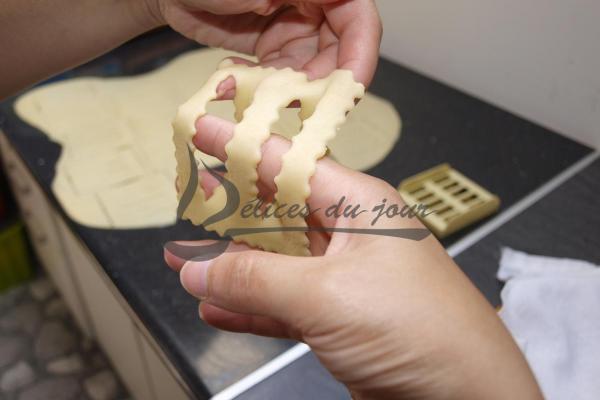 Étaler une boule au rouleau jusqu’à obtenir une épaisseur de 2 mm environ. Avec le moule spécial « griwech », découper les formes, sinon découper un rectangle de 5 lanières comme sur la photo ci-dessous.